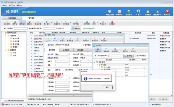 有用戶在使用信管飛 RMS過程中,遇到這樣的問題:修改客戶信息選擇部門時,系統(tǒng)提示 “當前部門存在下級部門,不能選擇”,導致操作無法繼續(xù)。這一提示并非故障,而是系統(tǒng)參數(shù)控制帶來的使用限制。