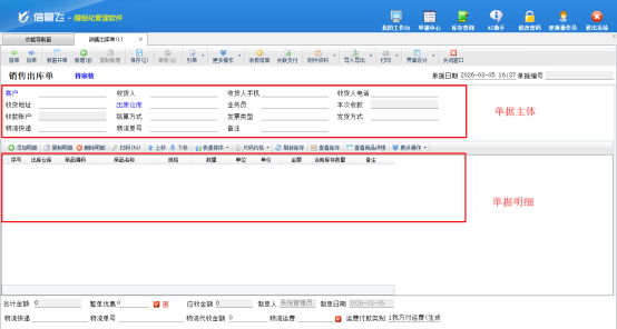 1、進(jìn)入開(kāi)單界面:登錄信管飛軟件后,在左側(cè)功能導(dǎo)航窗里,點(diǎn)擊“銷售管理”,再選擇“銷售出庫(kù)單”,就能進(jìn)入新開(kāi)銷售單的操作頁(yè)面;