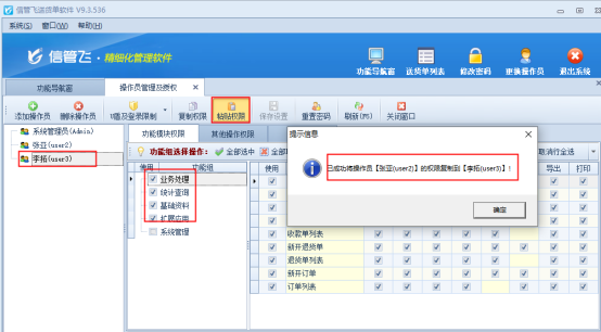 信管飛送貨單軟件、信管飛RMS軟件等都支持新增多個(gè)操作員并根據(jù)操作員設(shè)置不同的權(quán)限,當(dāng)新增員工時(shí),需要此員工添加為操作員且操作權(quán)限需要和之前員工一致,軟件支持快速?gòu)?fù)制已有操作員的權(quán)限,本文以“信管飛送貨單軟件”進(jìn)行示范下。 新增操作員“李拓”,在“基礎(chǔ)資料”—》“員工信息”中先添加姓名為“李拓”的員工