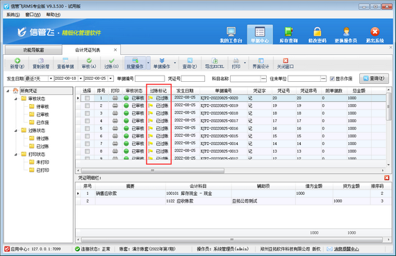 會(huì)計(jì)憑證是指記錄經(jīng)濟(jì)業(yè)務(wù)發(fā)生或完成情況的書(shū)面證明,包括原始憑證和記賬憑證,是登記賬簿的依據(jù)。會(huì)計(jì)憑證是記錄經(jīng)濟(jì)信息的載體;信管飛RMS專業(yè)版包含財(cái)務(wù)處理功能(使用賬務(wù)處理功能需要操作員具有一定的專業(yè)財(cái)務(wù)知識(shí)),可用來(lái)登記會(huì)計(jì)憑證。 軟件內(nèi)的做賬流程為:憑證輸入—憑證審核—憑證過(guò)賬—結(jié)轉(zhuǎn)損益—期末結(jié)賬,結(jié)賬后賬期自動(dòng)進(jìn)入下一賬