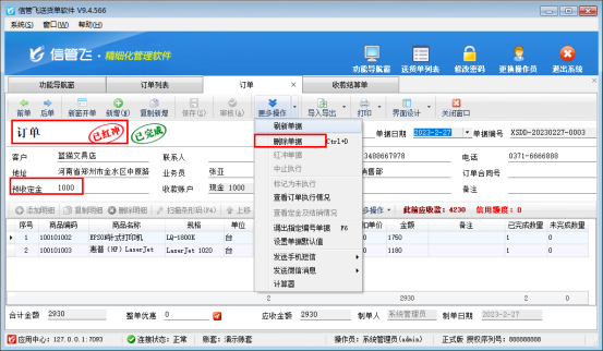演示視頻觀看鏈接:送貨單軟件如何刪除已完成的訂單演示視頻 信管飛送貨單軟件可以先開訂單,然后實際開送貨單引單進行發貨,有用戶使用中需要刪除已完成狀態的訂單,如何進行刪除操作?本文示范下。 已完成狀態的訂單分兩種:1、無定金;2、有定金。 &nb