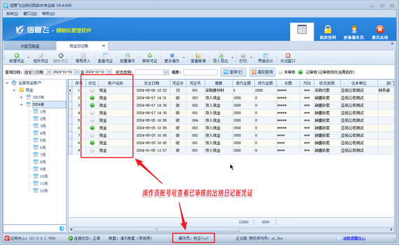 有用戶在使用信管飛出納記賬軟件時(shí),系統(tǒng)管理員賬號(hào)登錄軟件可以查看已審核的出納日記賬憑證,但是操作員賬號(hào)登錄軟件無法查看已審核的出納日記賬憑證,如下圖所示。 演示視頻觀看鏈接:操作員不可查看已審核的出納日記賬憑證,如何解決演示視頻 出現(xiàn)以上問題的原因是:操作員賬號(hào)沒有查看已審核的出納日記賬憑