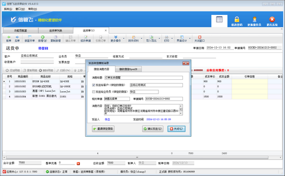 微信消息服務(wù)是信管飛軟件基于微信開放平臺研發(fā)的業(yè)務(wù)消息發(fā)送服務(wù),支持即時推送業(yè)務(wù)單據(jù)消息,如訂單通知、發(fā)貨信息等。支持客戶查看消息詳情(可配置外部查看數(shù)據(jù)項)、單據(jù)簽收確認(rèn)、分享轉(zhuǎn)發(fā)等功能。有用戶在填開單據(jù)后發(fā)送微信模板消息時,無法發(fā)送成功, 系統(tǒng)彈出提示信息“您沒有發(fā)送微信消息的權(quán)限,請與系統(tǒng)管理員聯(lián)系!”,如下圖所示。