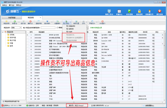 在企業(yè)的日常運營中,商品信息的安全至關(guān)重要,一旦泄露,可能會給企業(yè)帶來不可估量的損失。信管飛軟件敏銳洞察到這一需求,貼心提供可設(shè)置操作員不可導(dǎo)出商品信息的功能,為企業(yè)數(shù)據(jù)安全保駕護(hù)航。 以往,軟件中的商品信息可能因操作員權(quán)限設(shè)置不當(dāng)而面臨泄露風(fēng)險。有些操作員或許因疏忽或惡意,將商品信息導(dǎo)出并傳播,導(dǎo)致企業(yè)商業(yè)機(jī)密外泄。信管飛