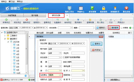 信管飛軟件刪除沒有開單的客戶信息時(shí)提示“當(dāng)前選擇的往來單位已有出納日記賬記錄,不能刪除”,如何解決?如下圖所示: 出現(xiàn)此提示是因?yàn)榇丝蛻粼诔黾{日記賬憑證中有錄入往來單位,需要分別打開現(xiàn)金和銀行日記賬列表界面。在工具欄“高級查詢”中按往來單位查詢,如下圖所示: