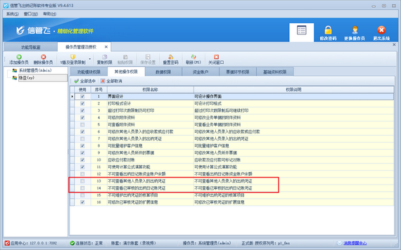 在財(cái)務(wù)工作中,出納憑證的準(zhǔn)確性與安全性至關(guān)重要。為避免因權(quán)限混亂導(dǎo)致數(shù)據(jù)篡改或誤操作,信管飛出納記賬軟件通過精細(xì)化權(quán)限管理功能,幫助企業(yè)實(shí)現(xiàn)“操作員不可修改其他人員錄入的出納憑證”的嚴(yán)格管控,有效降低財(cái)務(wù)風(fēng)險(xiǎn)。 系統(tǒng)管理員登錄軟件后,進(jìn)入“系統(tǒng)管理”—》“操作員及授權(quán)”界面,選擇目標(biāo)操作員賬號。在“其他操作權(quán)限”界面取消勾選