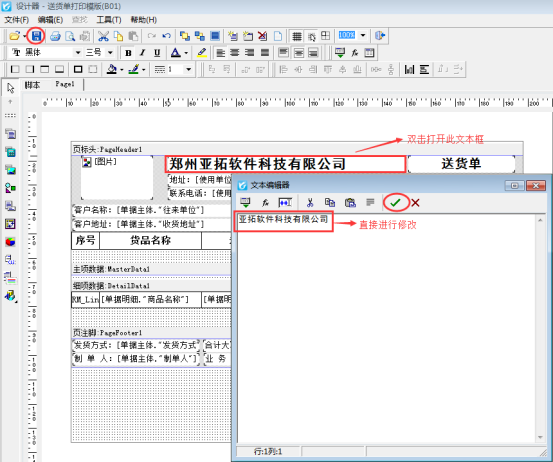 亞拓軟件下的紅管家送貨單軟件、亞拓管理軟件、紅管家倉庫管理軟件等支持打印單據(jù),軟件內(nèi)置了十幾種打印模板,軟件內(nèi)置的打印模板的單位名稱是自動調(diào)取使用單位名稱,有的客戶需要自定義設(shè)計模板中直接固定打印模板中的單位名稱,當(dāng)需要修改時不清楚怎么操作,我們以送貨單軟件為例,介紹下如何修改固定單位名稱的模板的單位名稱。 &nb
