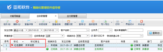 亞拓管理軟件和紅管家倉庫管理軟件都可以對應(yīng)收款管理、應(yīng)付款管理進(jìn)行標(biāo)記備注。送貨單軟件的應(yīng)收款管理中也可以對應(yīng)收款進(jìn)行標(biāo)記備注。下面我們以亞拓管理軟件專業(yè)版為例,介紹對應(yīng)收款管理標(biāo)記備注的操作步驟(應(yīng)付款和應(yīng)收款操作一致)。 在功能導(dǎo)航窗點“往來管理”—》“應(yīng)收款管理”即可進(jìn)入“應(yīng)收款管理”界面,在應(yīng)