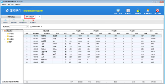 亞拓管理軟件(星光版、標(biāo)準(zhǔn)版、專業(yè)版)和紅管家倉(cāng)庫(kù)管理軟件都可以對(duì)倉(cāng)庫(kù)信息進(jìn)行管理,都可以查詢商品庫(kù)存數(shù)量。軟件支持建立多個(gè)倉(cāng)庫(kù),可以統(tǒng)計(jì)商品在不同倉(cāng)庫(kù)的庫(kù)存分布情況。支持按照商品名稱、商品類別等條件進(jìn)行匯總。本篇文章以亞拓管理軟件專業(yè)版為例介紹一下如何查詢商品庫(kù)存分布情況。 在功能導(dǎo)航窗點(diǎn)“倉(cāng)庫(kù)管理”—》“相關(guān)查詢統(tǒng)計(jì)”—