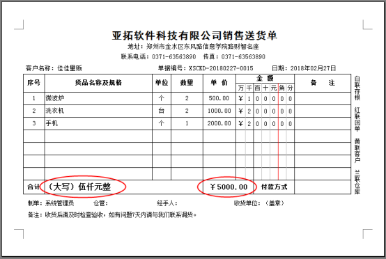 亞拓管理軟件、信管飛送貨單軟件、信管飛倉庫管理軟件等支持打印單據(jù)內(nèi)容,支持自定義設(shè)計打印模板,有時候模板字體需要加粗加大顯示,可以設(shè)置打印模板中的字體格式。我們以送貨單軟件為例,介紹下如何設(shè)置打印模板中字體加粗加大顯示。 先新增一個送貨單,正常開單后確認(rèn)開單,預(yù)覽之前的模板,合計金額的字體是未加粗樣式,如下圖1所示:&nbs