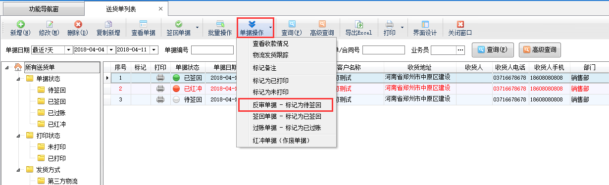 信管飛送貨單軟件通過(guò)狀態(tài)控制實(shí)現(xiàn)簡(jiǎn)單的流程管理(待簽回(新開(kāi)單)-》已簽回(業(yè)務(wù)員送貨回來(lái)或者客戶已簽收快遞)-》已過(guò)賬(財(cái)務(wù)確認(rèn)已收到貨款)),“已簽回”及“已過(guò)賬”的單據(jù)無(wú)法修改,但是部分情況下可能會(huì)需要修改“已簽回/已過(guò)賬”的單據(jù),如何修改呢?下面詳細(xì)介紹一下操作過(guò)程。圖一 “已簽回”及“已過(guò)賬”的送貨單單據(jù)無(wú)法修改,