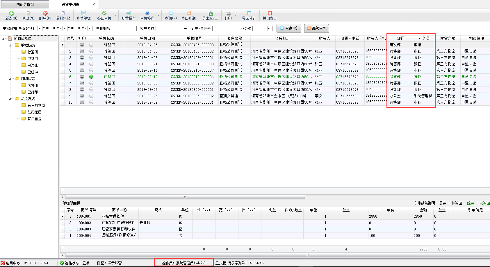 信管飛送貨單軟件、亞拓管理軟件(星光版、標(biāo)準(zhǔn)版、專業(yè)版)、信管飛倉(cāng)庫(kù)管理軟件,都支持設(shè)置多個(gè)操作員并對(duì)操作員進(jìn)行權(quán)限控制,通過(guò)設(shè)置操作員的“數(shù)據(jù)權(quán)限”,可以更精細(xì)的控制操作員對(duì)業(yè)務(wù)單據(jù)的查看權(quán)限。 以送貨單軟件為例,示范一下如何設(shè)置操作員僅能查看本部門人員數(shù)據(jù),“系統(tǒng)管理員”登錄軟件,在功能導(dǎo)航窗點(diǎn)擊“系統(tǒng)管理”—》“操作員