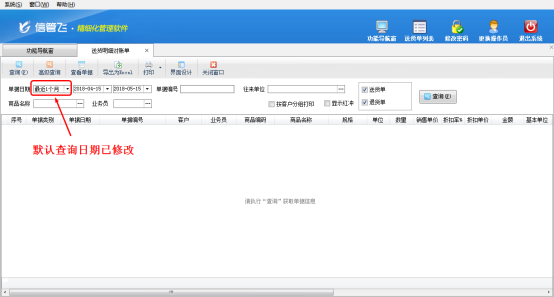 信管飛送貨單軟件、信管飛RMS(進(jìn)銷存軟件)、信管飛倉(cāng)庫(kù)管理軟件內(nèi)都包含了統(tǒng)計(jì)查詢功能(單據(jù)匯總表、單據(jù)明細(xì)表等統(tǒng)計(jì)查詢報(bào)表),軟件內(nèi)統(tǒng)計(jì)查詢功能默認(rèn)的查詢?nèi)掌跒椤白罱?天”(如下圖1所示),但是如果需要修改默認(rèn)查詢?nèi)掌冢撊绾涡薷哪兀肯旅嫖覀円孕殴茱w送貨單軟件為例詳細(xì)介紹下軟件內(nèi)如何修改默認(rèn)查詢?nèi)掌凇D1 送貨明細(xì)對(duì)賬單界面