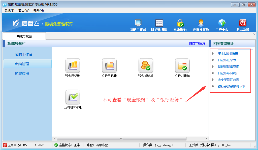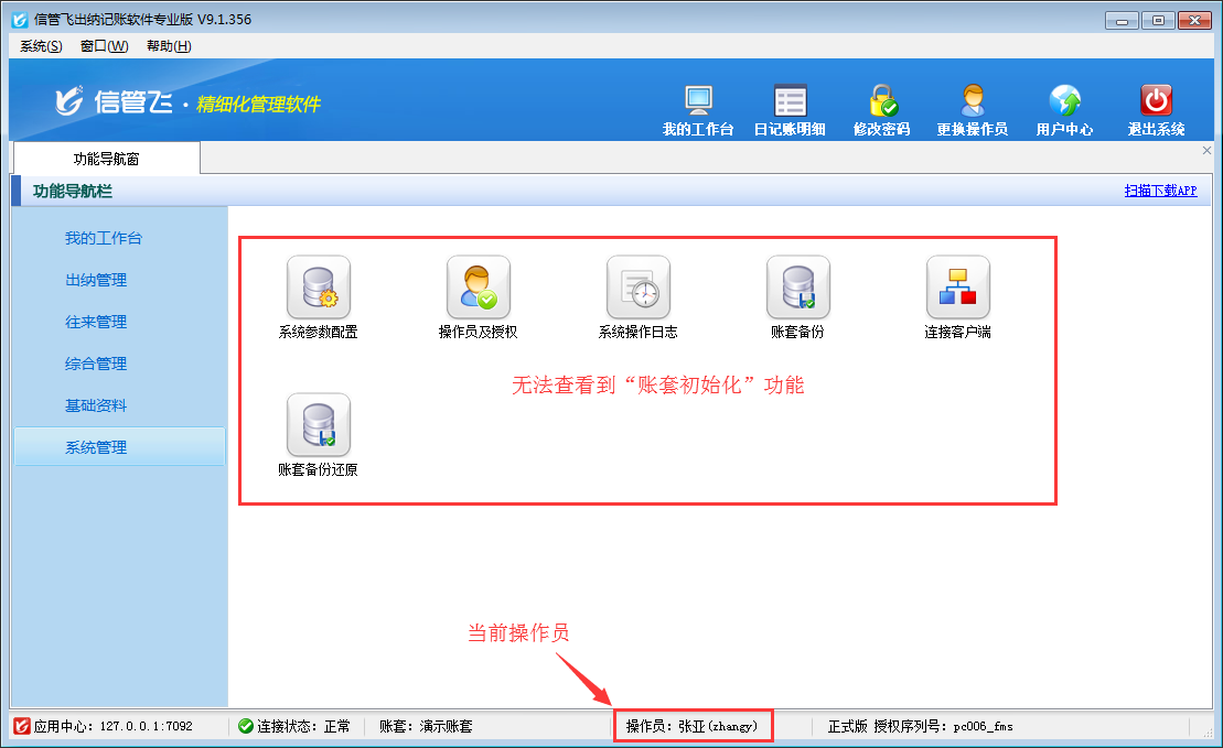 信管飛出納記賬軟件內(nèi)包含豐富的記賬統(tǒng)計表格,如現(xiàn)金賬簿、銀行賬簿、資金日(月)報表、收支類別匯總表等。如果不希望員工賬號登錄后查看到這些報表,如何設置呢?本篇文章以信管飛出納記賬軟件專業(yè)版為例演示一下出納記賬軟件內(nèi)如何設置操作員不可查看現(xiàn)金及銀行賬簿。 登錄軟件,在功能導航窗點擊“系統(tǒng)管理”—》“操作員及授權”,進入“操作員