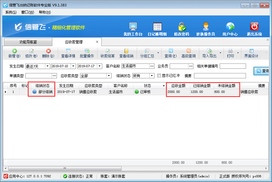 收款結算單用來登記收款信息(收款對象即客戶、收款賬戶、收款金額、經手人等),并結銷應收款記錄。正常情況下,應收金額為多少,即客戶支付我們多少貨款,但是部分情況下,客戶支付給我們貨款時可能因為各種原因只能給我們支付其中一部分,然后過段時間在支付剩余貨款。本篇文章以出納記賬軟件為例演示一下部分收款的情況下如何開收款結算單。 如下
