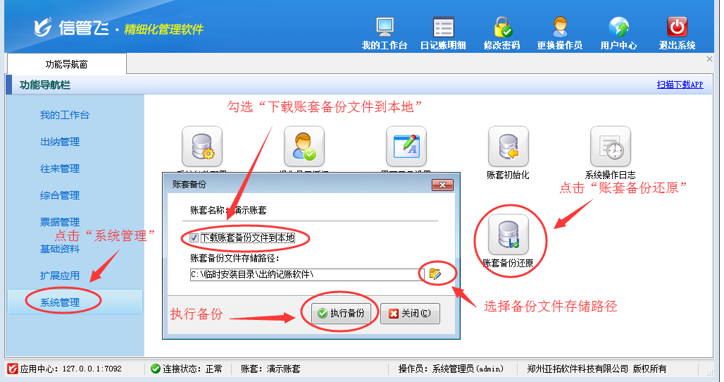 信管飛出納記賬軟件、信管飛送貨單軟件、信管飛RMS等軟件賬套數(shù)據(jù)默認存儲在軟件安裝目錄下,支持對賬套數(shù)據(jù)進行備份,如需要更換主機電腦,需要在原來的主機電腦上備份賬套數(shù)據(jù),將生成的備份文件復(fù)制到新的主機電腦上,然后在新的主機電腦上安裝軟件,使用備份文件還原數(shù)據(jù)即可。 以信管飛出納記賬軟件為例,演示一下更換電腦時如何在原來的主機