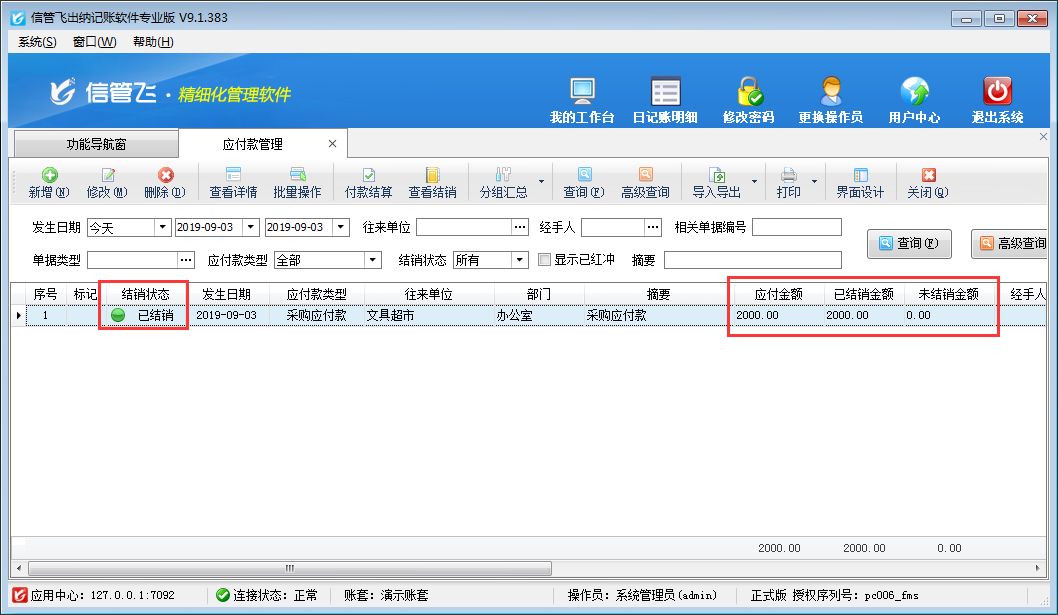 付款結(jié)算單可登記付款信息(付款對象即供應(yīng)商、付款賬戶、付款金額、經(jīng)手人等),并結(jié)銷應(yīng)付款記錄。本篇文章以出納記賬軟件為例演示一下對應(yīng)付款進行付款結(jié)算的操作步驟。 在功能導(dǎo)航窗點擊“往來管理”—》“應(yīng)付款管理”打開應(yīng)付款管理界面新增一條應(yīng)付款記錄,如下圖所示,供應(yīng)商“文具超市”應(yīng)付金額為2000元,已結(jié)銷金額為0。