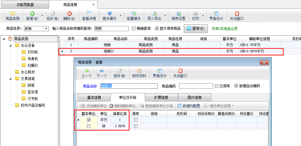 進(jìn)銷存軟件中支持多計量單位,可以添加商品輔助單位,即同一個商品存在多個不同的計量單位,這幾個單位之間存在一定的換算關(guān)系,開單時不管輸入哪一個單位,軟件都可以根據(jù)換算比例來自動進(jìn)行換算轉(zhuǎn)換。輔助單位信息內(nèi)顯示多單位換算關(guān)系,默認(rèn)保留兩位小數(shù)顯示(如下圖所示),如需設(shè)置保留多個小數(shù)位顯示,系統(tǒng)也支持通過參數(shù)配置進(jìn)行設(shè)置,本文介紹一下如何設(shè)置商品單位換算比率小數(shù)顯示