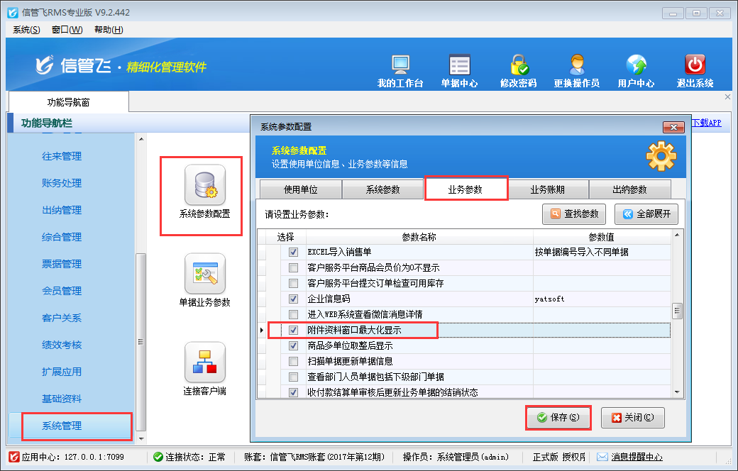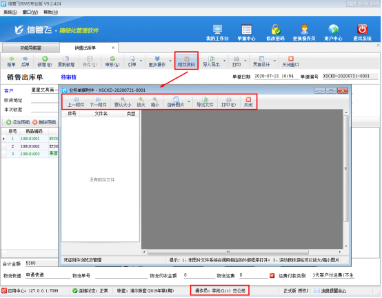 信管飛RMS(進(jìn)銷存管理軟件)新增或者修改業(yè)務(wù)單據(jù)時,支持添加文檔、圖表等附件資料,可掃描或?qū)肱c業(yè)務(wù)單據(jù)相關(guān)的電子文件,方便用戶更全面、直接地查詢業(yè)務(wù)單據(jù)的全過程,有利于企業(yè)對業(yè)務(wù)單據(jù)的管理(如下圖所示),附加資料窗口默認(rèn)顯示模式支持大窗口和小窗口兩種顯示模式,本文介紹一下如何設(shè)置附件資料窗口默認(rèn)顯示模式? 在功能導(dǎo)航窗點
