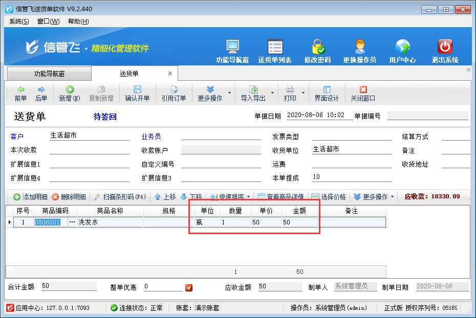 信管飛RMS、信管飛送貨單軟件等都支持開單前錄入好商品的預(yù)設(shè)價格,如預(yù)設(shè)采購價、預(yù)設(shè)售價等,方便開單選擇商品時自動獲取價格信息。如下圖所示,設(shè)置商品“洗發(fā)水”預(yù)設(shè)售價50元/瓶,以送貨單軟件為例示范一下如何設(shè)置新開送貨單時可自動取商品預(yù)設(shè)售價。 軟件支持價格優(yōu)先級設(shè)置,啟用價格優(yōu)先級后軟件可以自動調(diào)取我們設(shè)定的價格,可以幫助