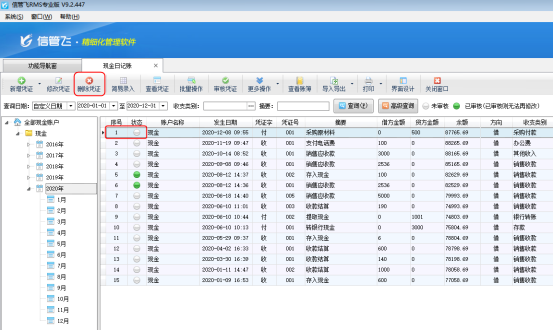 信管飛RMS標準版和專業版都包括登記出納日記賬憑證功能,在新增保存日記賬憑證后都可以直接審核憑證,憑證審核后,不允許直接刪除。客戶如果需要刪除已審核的憑證,需要先反審憑證,再進行刪除。下面我們介紹一下在信管飛RMS專業版中如何刪除已審核的日記賬憑證? 在功能導航窗點“出納管理”—》“現金日記賬”即可進入“現金日記賬”界面,對