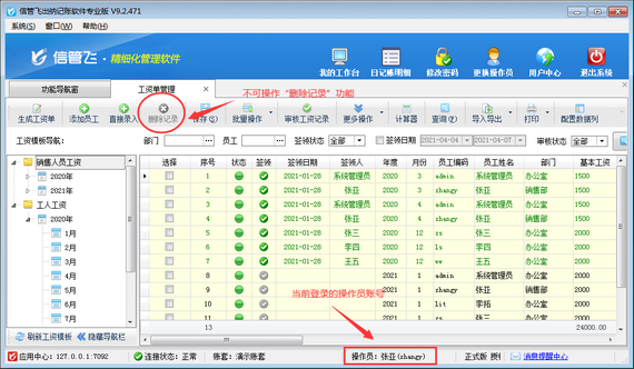 信管飛出納記賬軟件專業版包括工資管理功能,支持自定義工資模板管理員工工資單,可根據設置的工資模板快速生成工資單,支持從上月工資單復制工資項目數據。為了避免操作員刪除工資單,軟件中可以設置操作員不可刪除工資記錄權限。下邊我們在軟件中示范下設置操作員不可刪除工資記錄權限的操作步驟。 登錄軟件,在功能導航窗點擊“系統管理”—》“操