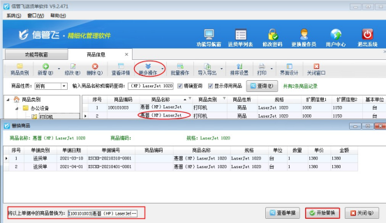 “替換商品(業(yè)務單據(jù))”顧名思義指可以把業(yè)務單據(jù)中的該商品批量替換為另外一個商品。軟件中替換商品功能一般作用于以下兩種情況:①開單選擇錯商品,可直接在商品信息中替換為正確的商品;②存在已開單重復的商品無法刪除。本文以第二種情況進行示范。 信管飛送貨單軟件、信管飛RMS軟件都支持維護商品信息,軟件默認刪